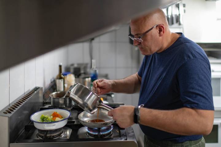 Cocina en 'La Gaviota', un restaurante construido sobre piedra volcánica en un lugar privilegiado de la costa salvaje de Barlovento, al noreste de la isla. El paisaje natural que lo rodea es de postal. Por un lado, están los acantilados de la Reserva Natural Especial de Guelguén, donde las olas golpean con furia sobre las rocas y la bruma asciende sobre Punta Gaviota, la montaña que da nombre al restaurante. Por otro, justo debajo de su terraza, están las piscinas naturales de la Fajana, tres charcos protegidos del oleaje que invitan a un chapuzón en aguas tranquilas y cristalinas.