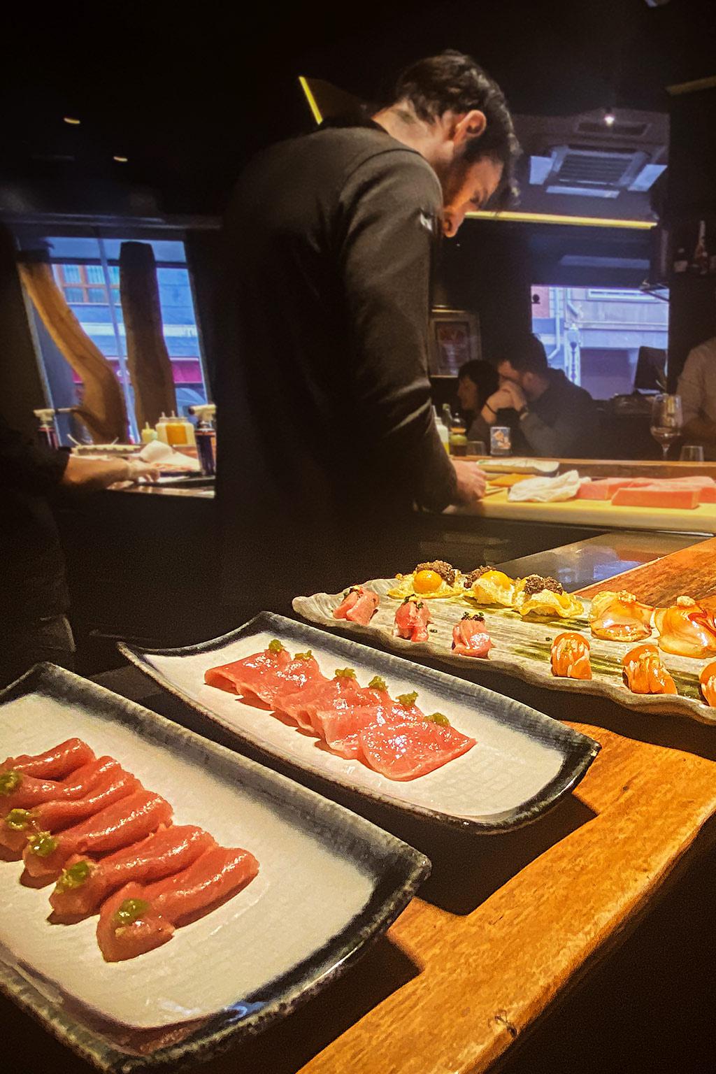 Su paso por ‘Kabuki’ le enseñó también las claves de una suerte de fusión o mestizaje que él aplica a la tradición autóctona, palpable en una carta que incluye tanto nigiris castizos como sashimis aderezados con salsas conocidas del recetario vasco. El requisito autoimpuesto es que todo ha de estar rico y la calidad del producto salta a la vista, se trate de pescado del Cantábrico o wagyu japonés.