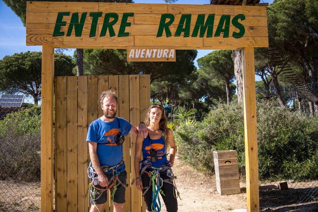 Tras mucho buscar dieron con este paraje privilegiado en Roche –a escasos kilómetros de Conil de la Frontera–, una de las urbanizaciones costeras más valoradas de Cádiz, e instalaron su parque aventura. Ella, profesora de Educación Física nacida en Sevilla; él, guía de montaña natural de Montpellier. La inspiración para levantar hace más de una década la iniciativa –cumple ahora nueve años abierta al público– les llegó mediante la propia experiencia de disfrutar de este tipo de proyectos en los Pirineos y a través de amigos franceses que "ya trabajaban allí en parques así. Aquí en España no es que no hubiera nada, pero no eran muy conocidos".